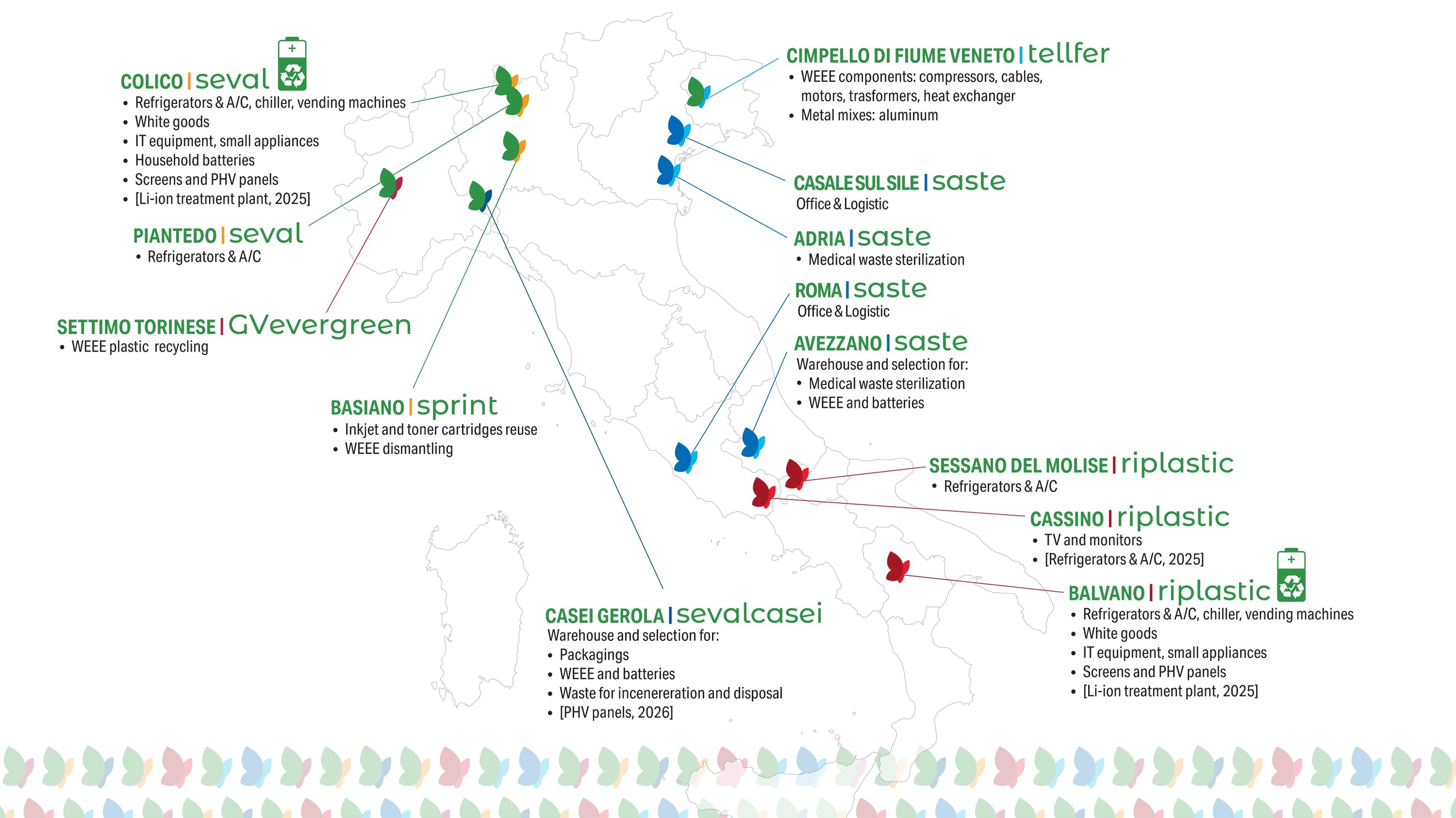 Seval is the leading operator in the management of WEEE, cells and batteries. Together with its related companies Riplastic (recycling of WEEE and batteries), Tellfer (recycling of cables, motors and compressors), Seval Casei (sorting of paper, packaging, bulky and 191212), Sprint (toner), GV Evergreen (rigid plastics) , Saste (collection and disposal of hospital waste), Steriladria (sterilization of hospital waste) covers a vast area of ??activity in the world of recycling and waste disposal.